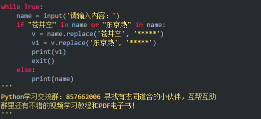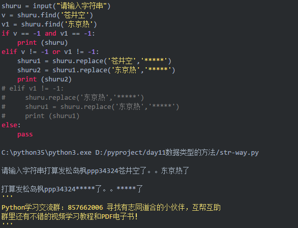 然后用if判断,如果2个值都等于-1,才证明不包含定义的2个敏感词,就正常打印,如果包含一个敏感词或者是包含2个敏感词都包含,就执行替换的操作
