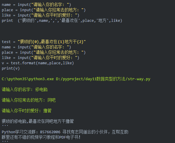 需求:等待用户输入名字、地点、爱好、根据用户的名字和爱好进行任意显示
