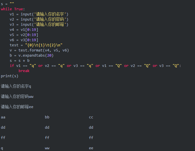 循环提示用户输入:用户名、密码、邮箱(要求用户输入的长度不能超过20个字符,如果超过则只有前20个字符有效),如果用户输入q或者Q表示不再继续输入,将用户的内容一表格形式打印
