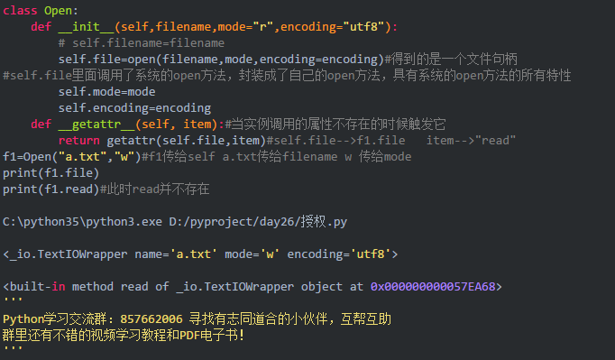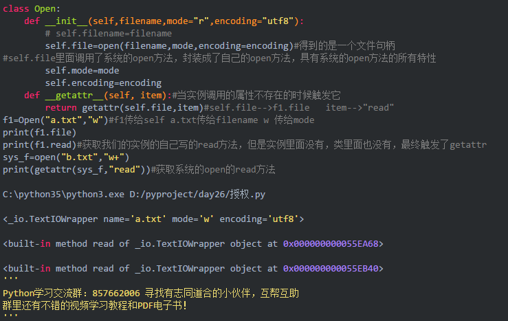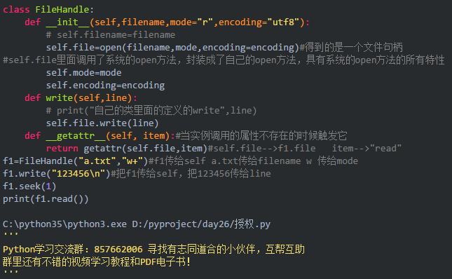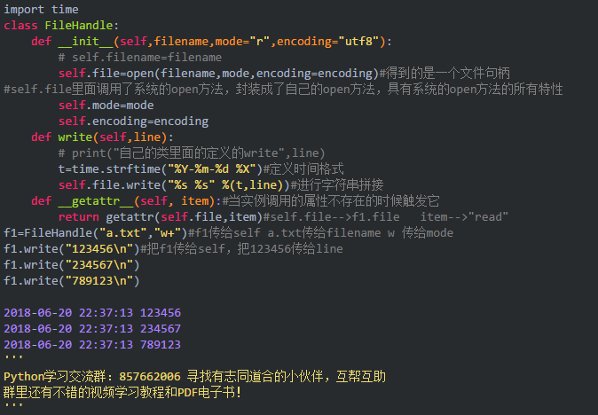 这种就是组合的方式,给self.file赋予了一个文件描述符,然后利用__getattr__来return所有正常的open里面的所有的属性,如果我们不自己定制write的方法的话,所有的方法就已经是跟系统的方法一样了,但是我们自己定制了write的方法了,给前面加了时间,当然也可以做其他的,比如直接pass,那其他人在调用write的方法的时候就写入不了了