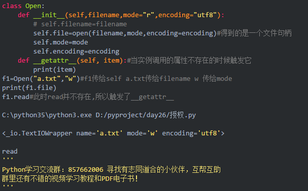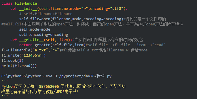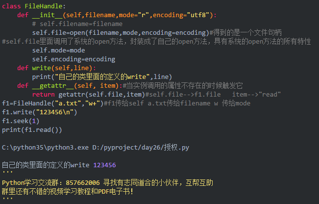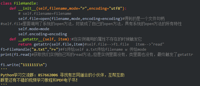 结果是a.txt里面成功写入了,现在就牛逼了。我们发现我们的实例f1是通过FileHandle这个方法进行write的,并不是系统的open的方法里面的write属性,是经过了getattr中转了一下。