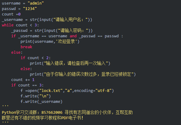 写一个登录程序,登录成功之后,提示XXX欢迎登录,登录失败3次后,提示账户锁定