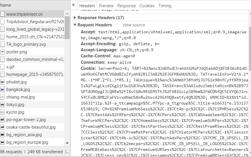 这时候我们点击途中的第一个网页,在headers中,request和response的信息全部记载在这个监视器中,我们点击Request Headers,在这里我们可以看到网页请求的方式以及一些其他的特定的信息都已显示在这里。下图中我们可以看到这个网页的cookie。