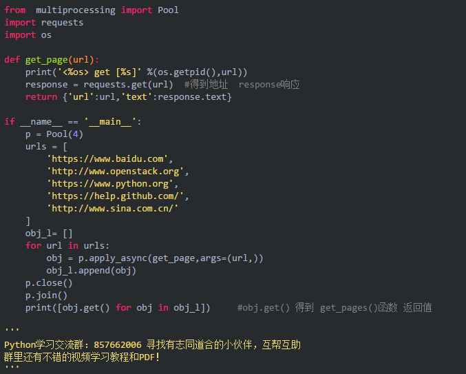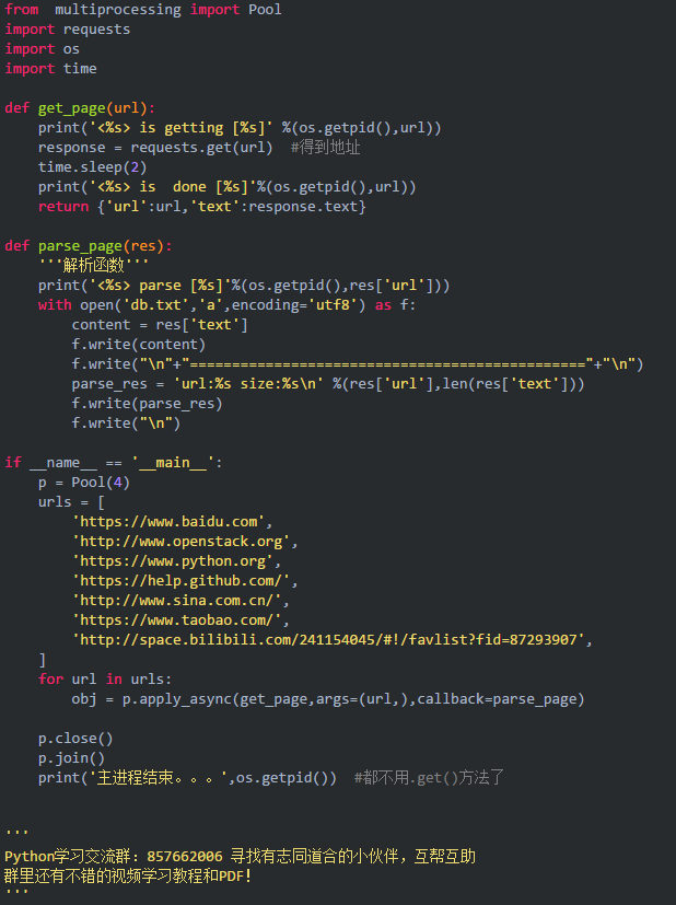我们可以把耗时间(阻塞)的任务放到进程池中,然后指定回调函数(主进程负责执行),这样主进程在执行回调函数时就省去了I/O的过程,直接拿到的是任务的结果。