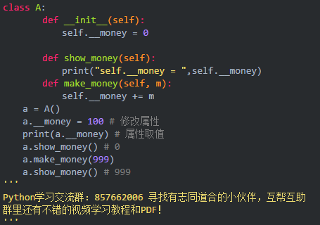python类中以双下划线'__' 开头,不以双下划线结尾的标识符为私有成员,私有成员只能使用方法进行访问和修改