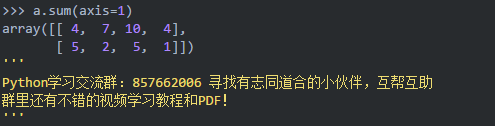 所以sum(axis=1)的值是 [ [4, 7, 10, 4], [5, 2, 5, 1]]. 验证如下,正确。