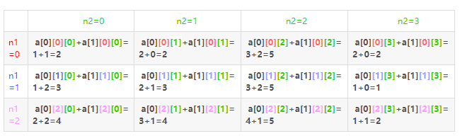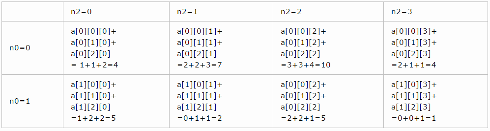 如何求sum的各个元素呢,sum = a[0][n1][n2]+a[1][n1][n2]这个公式又如何理解呢?如下。我们可以做一个表格:注意颜色