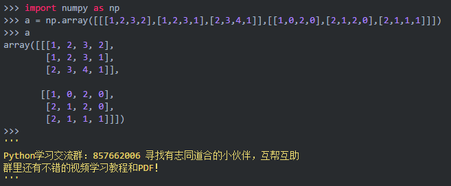 前面说了axis的取值(以数组a为例),axis=0,1,2。在这里,精确定位到某个元素可以用a[n0][n1][n2]表示。n0的取值是0,1(数组两维),代表第一个索引;n1的取值是0,1,2(每一维数组拥有3个子数组),代表第二个索引;n2的取值是0,1,2,3(每个子数组有4个元素),代表第三个索引,这几个取值在后面会用到。