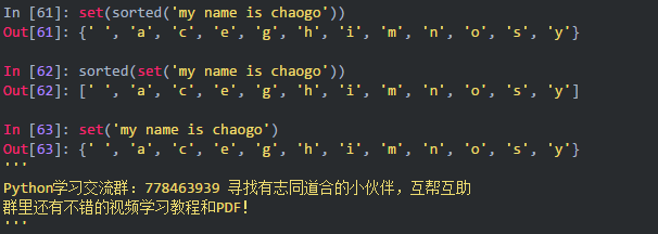 上面的结果都是一样的,什么原因呢?这是因为:(1)set和sorted是对序列进行操作,当参数不是序列时,会默认转换为列表;(2)set默认会对元素进行排序。