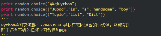 random.choice从序列中获取一个随机元素。其函数原型为:random.choice(sequence)。参数sequence表示一个有序类型。这里要说明一下:sequence在python不是一种特定的类型,而是泛指一系列的类型。list, tuple, 字符串都属于sequence。有关sequence可以查看python手册数据模型这一章,也可以参考:http://www.17xie.com/read-37422.html。下面是使用choice的一些例子: