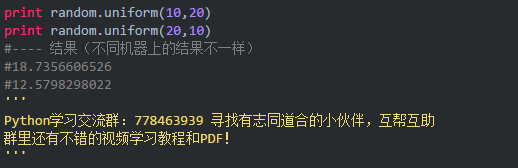 random.uniform的函数原型为:random.uniform(a, b),用于生成一个指定范围内的随机符点数,两个参数其中一个是上限,一个是下限。如果a > b,则生成的随机数n: a <= n <= b。如果 a <b, 则 b <= n <= a。