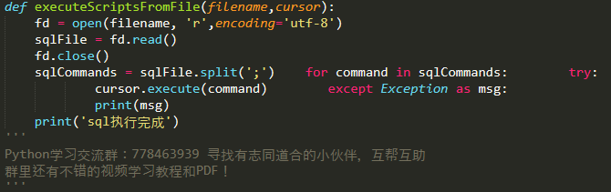 这是用于执行sql文件,这里第一句就有个坑,最好设置encoding='utf-8'否则可能会报错UnicodeEncodeError: 'latin-1' codec can't encode characters in position 41-44: ordinal not in range(256),当读取了sql文件后用;分割语句然后用for循环依次执行sql语句