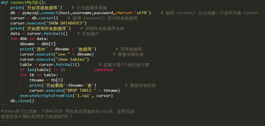 这一段比较容易理解了,首先是连接数据库,注意还是最好设置一下charset='utf8',因为我要操作多个数据库执行sql文件,所以先把数据库名称全部获取出来,这里获取出来的结果是元组类型,即使for循环后出来的也是一个元组,所以用[0]取出元组中的值,然后选中数据库执行删表操作(当然不是每个人都要按我这些操作哈,需要执行啥操作就自己改SQL语句),表删完了,然后开始执行1.sql文件,执行完成后关闭数据库