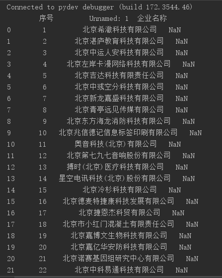 执行以上代码,成功打印出表格中的所有企业名称,查看打印的 df 的结构,如下图: