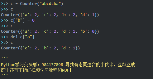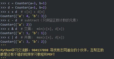 +、-、&、|操作也可以用于Counter。其中&和|操作分别返回两个Counter对象各元素的最小值和最大值。需要注意的是,得到的Counter对象将删除小于1的元素。
