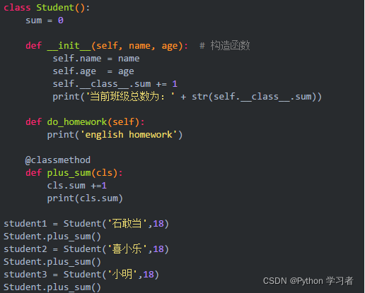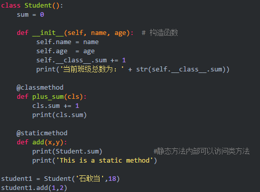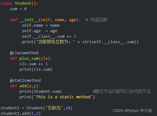使用装饰器@classmethod。第一参数必须是当前类对象,该参数名一般约定为「cls」,当然cls也可以换成其他名字,通过它来传递类的属性和方法(不能传实例的属性和方法)
