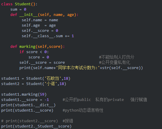 应用场景:定义一个学生类名,在这个类下面,定义分数这个对象,现要给每个学生打一个分数,如果我们允许从外部修改分数,那么如果分数修改为-1时,就与逻辑不符,所以,我们需要通过对变量私有化,以及在类的内部定义一个方法,通过对方法修改变量,就可以对输入的分数做出正确判断。