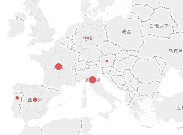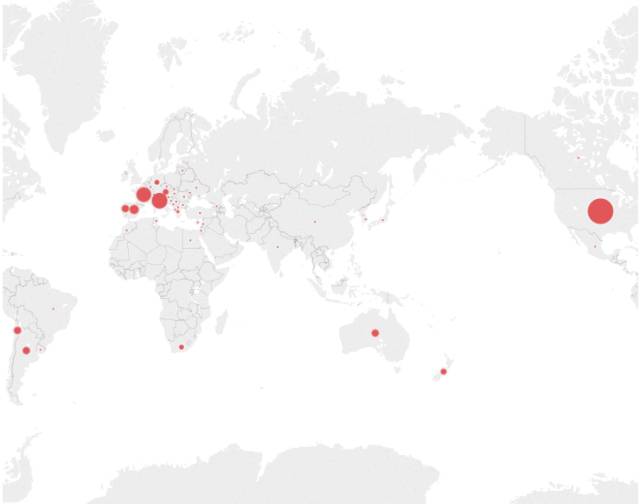 看看这些国家在全球的分布(点的大小代表葡萄酒品种多):