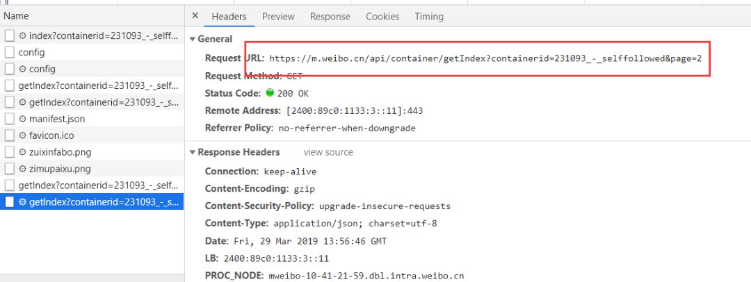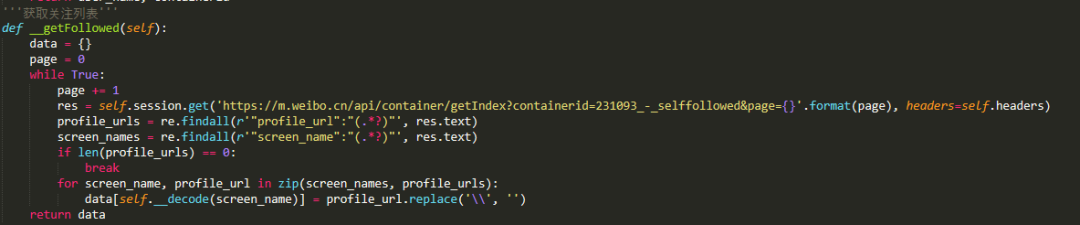 只要不断请求(page每次加1)上图中红框框出的链接直到返回的数据为空就可以获取登录用户的关注列表中的所有用户信息了,具体代码如下: