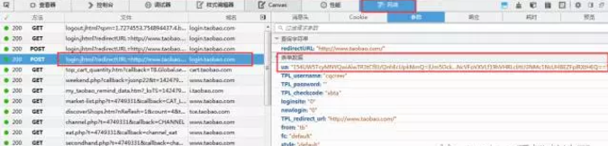 等跳转成功后,你就可以看到好多日志记录了,点击图中的那一行 login.taobo.com,然后查看参数,你就会发现表单数据了,其中就包括 ua 还有下面的 password2,把这俩复制下来,我们之后要用到的。这就是我们需要的 ua 还有 aes 加密后的密码。