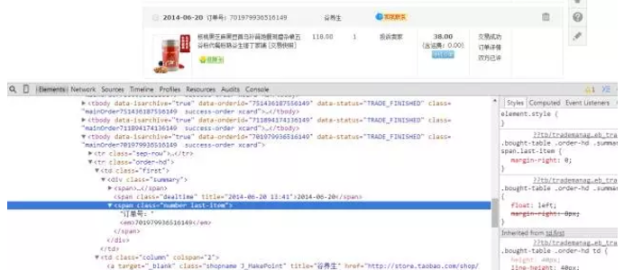 这是我的已买到的宝贝界面,审查元素可以看到,每一个宝贝都是tbody标签包围着。