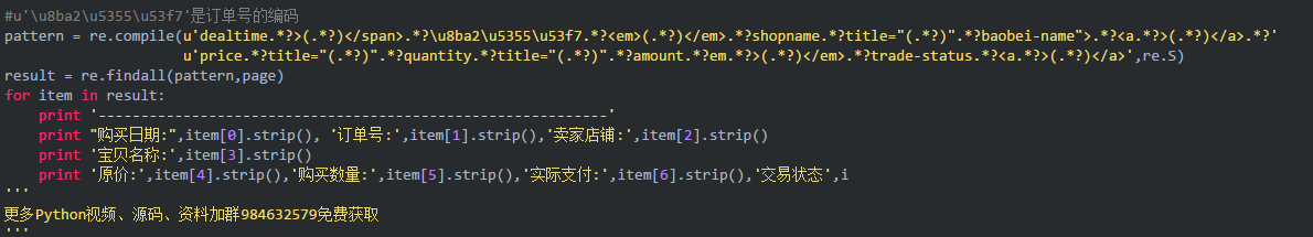 我们现在想获取订单时间,订单号,卖家店铺名称,宝贝名称,原价,购买数量,最后付款多少,交易状态这几个量,具体就不再分析啦,正则表达式还不熟悉的同学请参考前面所说的正则表达式的用法,在这里,正则表达式匹配的代码是