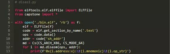 其中capstone是反汇编引擎,将使用脚本和pyelftools来帮助解析ELF文件。