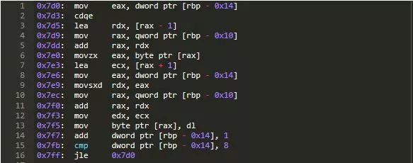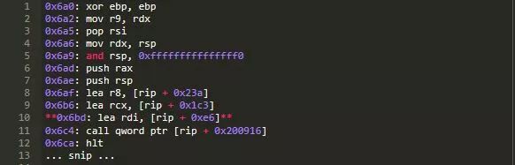 但这次是在lea或Load Effective Address指令处,它将一些地址[rip + 0xe6]加载到rdi寄存器中。 [rip + 0xe6]的计算结果为0x7aa,恰好是main()函数的地址!你问 我怎么知道的? 因为__libc_start_main()在执行任何操作之后,最终会跳转到rdi处的函数,这通常就是main()函数。它看起来就像这样。