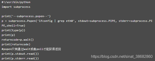 如果想使用shell中的管道,重定向,文件通配符,环境变量等功能,例如”ifconfig |grep eth0 > mm”,那么只能使用shell=True,并且使用字符串来传递。