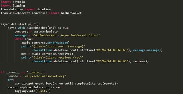 它的安装和其他库一样简单,使用 pip install aiowebsocket 即可。安装好后,我们可以根据 ReadMe 中提供的示例代码来测试: