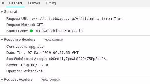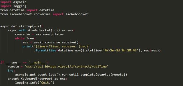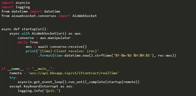 从刚才的网络请求记录中,我们得知目标网站的 WebSocket 地址为:wss://api.bbxapp.vip/v1/ifcontract/realTime,从地址中可以看出目标网站使用的是 wss,也就是 ws 的安全版,它们的关系跟 HTTP/HTTPS 一样。aiowebsocket 会自动处理并识别 ssl,所以我们并不需要作额外的操作,只需要将目标地址赋值给连接 uri 即可: