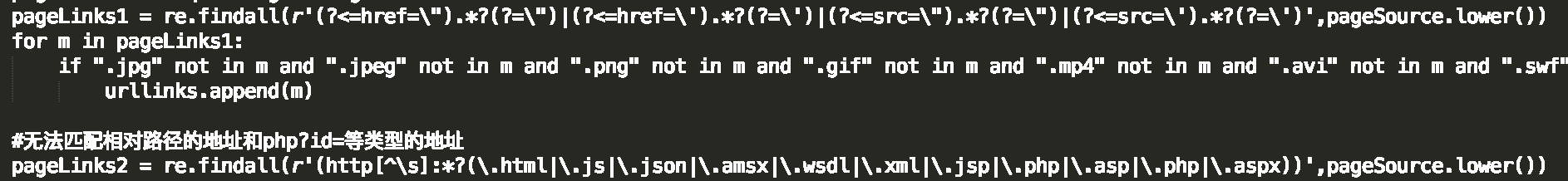 第一个无法爬取页面注释中的地址(<!–http://example.com/index.html–>),第二个无法爬取相对路径和php?id=等类型的地址,古结合两种规则,并排除图片视频类的地址,最后再去重