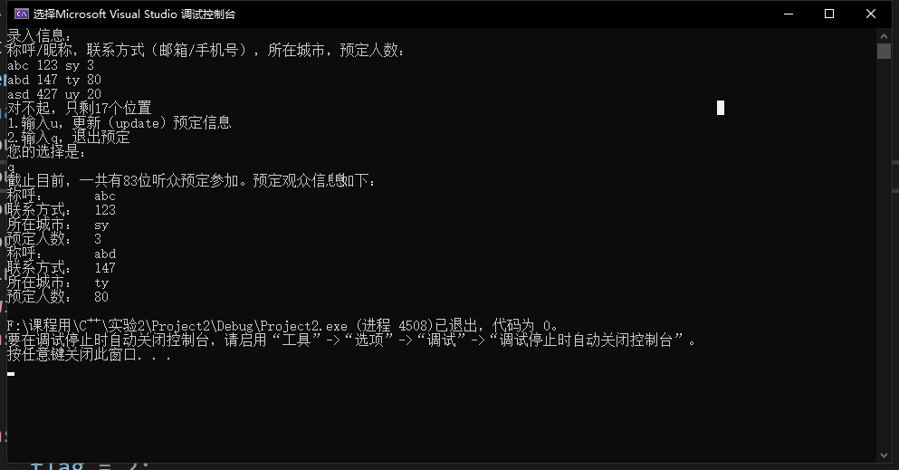 #include"Info.hpp" #include<iostream> #include<vector> int main() { using namespace std; vector<Info> audience_info_list; const int capacity = 100; int temp = 0; string nickname, contact, city; int num; cout << "录入信息:" << endl; cout << "称呼/昵称,联系方式(邮箱/手机号),所在城市,预定人数:" << endl; while (cin >> nickname) { int flag = 0; cin >> contact >> city >> num; Info t{ nickname, contact, city, num }; if (temp + num > capacity) { char x; cout << "对不起,只剩" << capacity - temp << "个位置" << endl; cout << "1.输入u,更新(update)预定信息" << endl; cout << "2.输入q,退出预定" << endl; cout << "您的选择是:" << endl; cin >> x; switch (x) { case 'u': flag = 1; break; case 'q': flag = 2; break; default: flag = 2; cout << "输入错误,已为您退出预定"; break; } } if (flag == 2) break; else if (flag == 0) { temp += num; audience_info_list.push_back(t); } } cout << "截止目前,一共有" << temp << "位听众预定参加。预定观众信息如下:" << endl; for (auto it = audience_info_list.begin(); it != audience_info_list.end(); ++it) it->print(); }