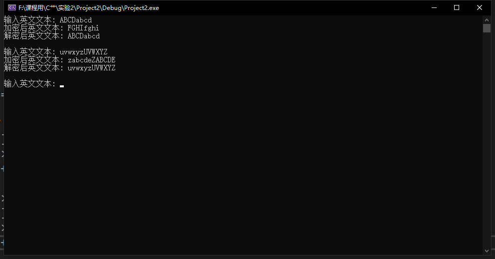 #include <iostream> #include<string> using namespace std; class TextCoder { public: TextCoder(string &a):text(a){} string decoder(){ int i ; string s; s = text; for (i = 0; s[i] != '\0'; i++) { if (s[i] >= 102 && s[i] <= 122) s[i] = s[i] - 5; else if (s[i] >= 97 && s[i] < 102) s[i] = 122 - 4 + s[i] - 97; else if (s[i] >= 70 && s[i] <= 90) s[i] = s[i] - 5; else if (s[i] >= 65 && s[i] <= 69) s[i] = 90 - 4 + s[i] - 65; } text = s; return s; } string encoder() { int i; string s; s = text; for (i = 0; s[i] != '\0'; i++) { if (s[i] >= 97 && s[i] <= 117) s[i] = s[i] + 5; else if (s[i] >= 118 && s[i] <= 122) s[i] = 97 + 4 + s[i] -122; else if (s[i] >= 65 && s[i] <= 85) s[i] = s[i] + 5; else if (s[i] >= 86 && s[i] <= 90) s[i] = 65 + 4 + s[i] - 90; } text = s; return s; } private: string text; };