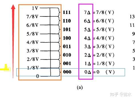 (2)将取样值转换成数字量也需要一定的标准(参考标准)。我们在表达一个数字量大小的时候,必须要有一个最小数量单位(标准)。其他数字量都是这个最小单位的整数倍。因此我们在进行量化的过程中不可避免的就存在了误差。如下图