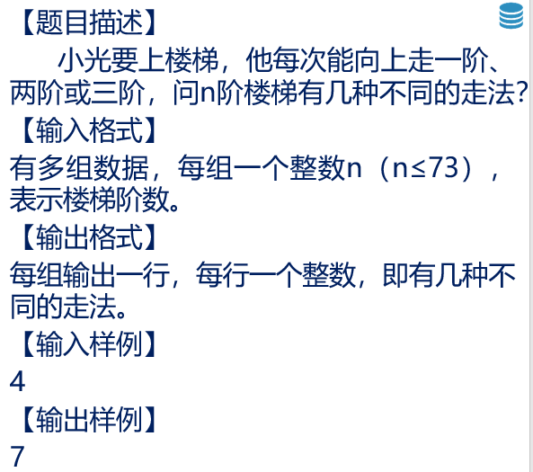 void s1() { //上楼梯 int n; cin>>n; unsigned long long F[75]= {0,1,2,4}; for(int i=4; i<=n; i++) F[i]=F[i-3]+F[i-2]+F[i-1]; cout<<F[n]; }