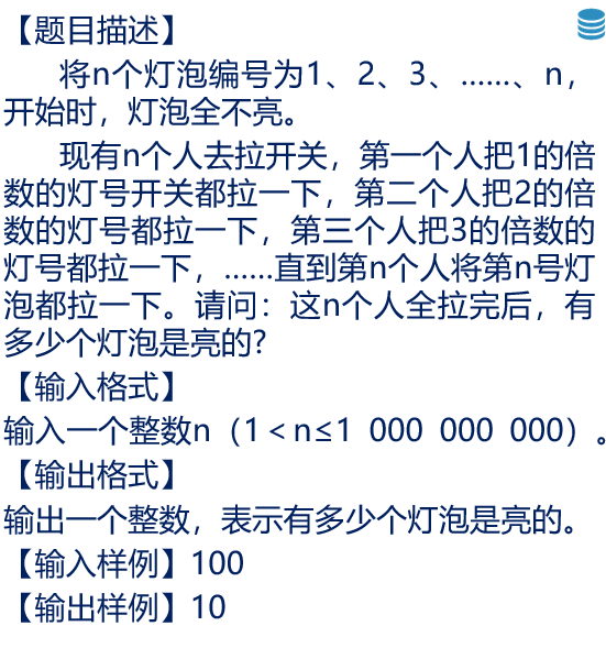 void s5() { //开关灯2 bool a[10000]; long long n; cin>>n; for(long long i=1;i<=n;i++) { a[i]=false; } for(long long i=1;i<=n;i++) { for(long long j=i;j<=n;j+=i) { a[j]=!a[j]; } } int ans=0; for(long long i=1;i<=n;i++) { if(a[i]) { ans++; } } cout<<ans; cout << endl; } #include<cmath> void s5_1() { unsigned long long n; cin>>n; cout<<int(sqrt(n))<<endl; //sqrt 数字的平方根 }