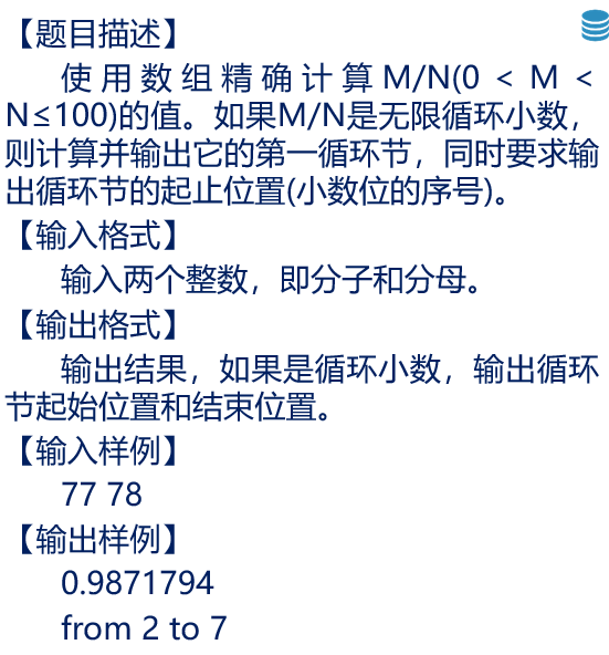 void s11() { //求分数的精确值 int shang1[101]={0};//保存商 int yushu[101]={0};//保存余数 int m,n,beg,end,j=0; int flag=0; //无线循环小数 cin>>m>>n;//m/n 0<m<n<=100 //cout<<m<<"/"<<n<<"=0."; for (int i=1;i<=100;i++) //i: 商的位数 { yushu[i]=m; //余数 m=m*10; //余数扩大10位 shang1[i]=m/n; //商 m=m%n; //求余数 if (m==0) //整除了 {beg=1;end=i;flag=1;break;} for(j=i-1;j>=1;j--) { if(yushu[j]==yushu[i]) { beg=j; end=i; break; } } if(j>0) //找到了相同的余数,循环节就出现了 break; } if(flag) { //结果为有限循环小数 cout<<"begin:"<<beg<<" "<<"end:"<<end<<endl; cout<<"The result of M/N is a finite fraction of 0."; for(j=beg;j<=end;j++) cout<<shang1[j]; } else { //结果为无限循环小数 cout<<"The result of M/N is an infinite loop fraction of 0."; for(j=1;j<end;j++) cout<<shang1[j]; cout<<endl; cout<<"Its loop section starts from the bit and the loop section is: "<<beg<<" To "<<end-1<<endl; for(j=beg;j<end;j++) cout<<shang1[j]; } cout<<endl; }