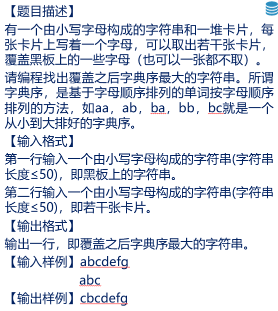 void zifuchuan7() { //字符串游戏 char a[60],b[60]; cin.getline(a,59); cin.getline(b,59); int alen=strlen(a); int blen=strlen(b); for(int j=0; j<blen-1; j++)//对b[]冒泡排序 for(int i=0; i<blen-j-1; i++) if(b[i]<b[i+1]) swap(b[i],b[i+1]); for(int i=0,j=0; i<alen && j<blen; i++)//遍历一遍a[] if(b[j]>a[i]) //如果可以覆盖,则覆盖 { a[i]=b[j]; j++; } puts(a); }