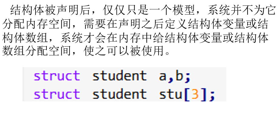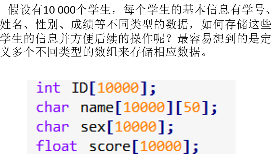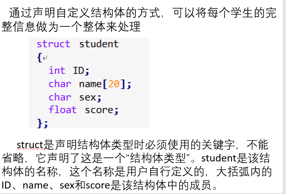 struct student { int ID; char name[20]; char sex; float score; }; struct student s[4]= {{ 10001,"张三",'M',95 }, {10002,"李四",'F',92}, {10002,"王五",'F',96} }; //定义了结构体数组stu[4]并对前两个赋值