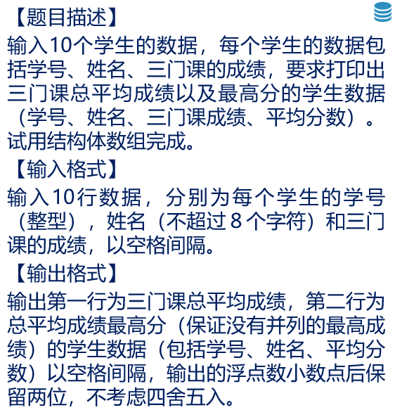 struct student1 { int num; char name[8]; int mark[3]; } person1[11]; #include<iomanip> void f22() { //统计成绩 freopen("score.in","r",stdin); int maxi=0; float aver,aver1,max=0,sum=0; for(int i=0; i<10; i++) { cin>>person1[i].num>>person1[i].name; cin>>person1[i].mark[0]>>person1[i].mark[1]>>person1[i].mark[2]; sum+=person1[i].mark[0]; sum+=person1[i].mark[1]; sum+=person1[i].mark[2]; aver1=(float)(person1[i].mark[0]+person1[i].mark[1]+person1[i].mark[2]); aver1=aver1/3; if(aver1>max) { max=aver1; maxi=i; } } aver=sum/30; cout<<setprecision(2)<<fixed<<aver<<endl; cout<<person1[maxi].num<<" "<<person1[maxi].name<<" "<<setprecision(2)<<fixed<<max<<endl; }