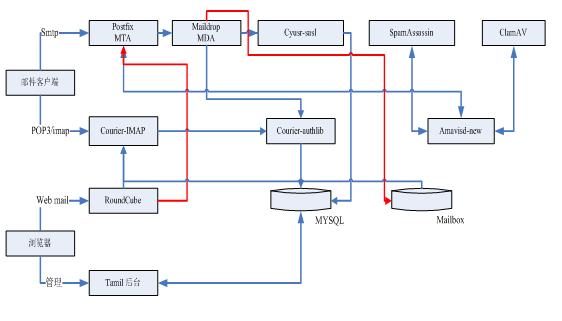 现有邮件服务器包含CentOS 5.3(Community Enterprise Operating System社区企业操作系统) + Postfix(MTA 邮件代理)+ Maildrop(MDA邮件分发代理) + SpamAssasin(垃圾邮件过滤) + Clamav(病毒过滤) + Courier-IMAP(IMAP协议支持) + Courier-AUTHLIB (账户认证) + Tmail 后台管理中心 + RoundCube Webmail 等。