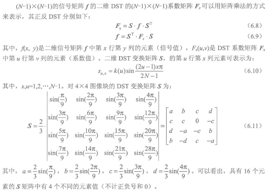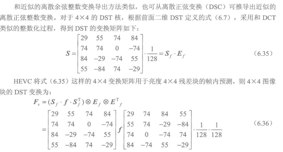 在帧内预测时,当前块的预测参考为紧邻该块左边和上边的已编码块的数据。像素间的相关性是随距离增大而减小的,因此预测块越是左边和上边的像素的预测越是准确,预测误差越小。也就是沿着编码块水平方向向右,预测误差逐渐增大:沿着垂直方向向下,预测误差也逐渐增大。这样的预测误差数据的分布和 DCT 的余弦基函数并不符合,因为余弦函数的特点是起始值最大,而后逐渐减小。而这一数据分布特点正好和离散正弦变换(DST)的正弦基函数比较一致,在起始处最小,然后逐渐增大。根据变换编码的特点,变换基函数和信号的相似程度越高,其乐缩率越大,因此HEVC 对内预测4X4亮度残差TB 的所有的模式都采用可分离整数近似离散正弦变换(DST),以利于图像压缩率的提高。