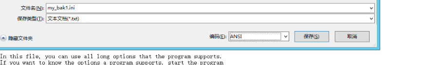 4.(如果没有报错忽略这个)保存后发现重启mysql服务报错,原因是编码问题 需要把它存为ANSI,保存然后再启动就可以。