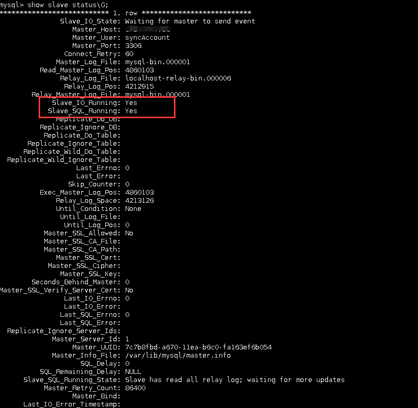 应用连接到master命令: mysql->change master to master_host='172.16.0.86',master_user='syncAccount',master_password='xxxxxx', master_log_file='mysql-bin.000001',master_log_pos=30236;