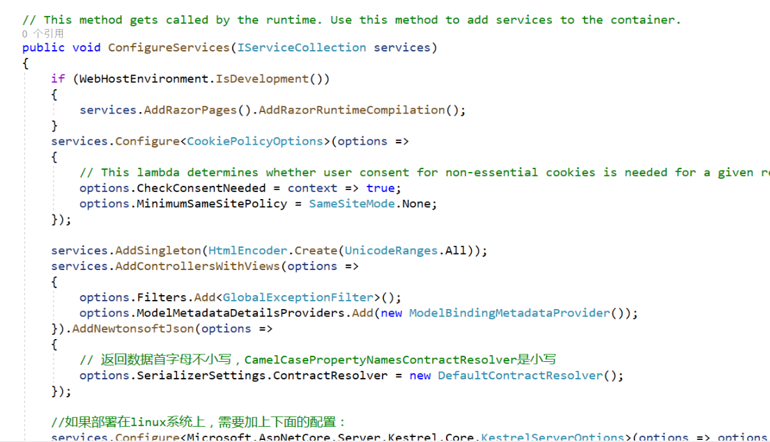 ConfigureService方法用于定义我们的应用程序所用的服务。(比如MVC Core、EFCore、Identity等) 在这里可以让程序员添加自己需要的服务。服务就是应用中通用的调用组件,通过依赖注入获取和使用。