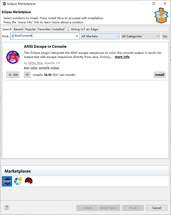 Help- > EclipseMarketplace- > find AnsiConsole, 然后单击install进行安装