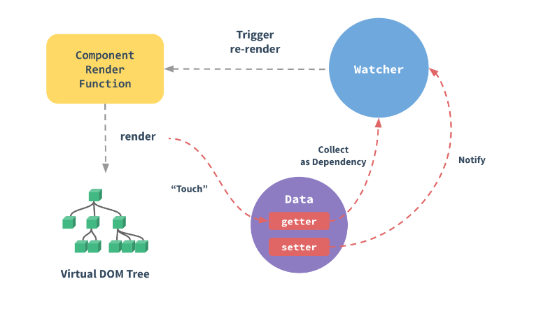 之后当依赖项的setter触发时,会通知watcher,从而使它关联的组件重新渲染。