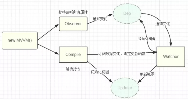 4.MVVM作为数据绑定的入口,整合observer,compile和watcher三者,通过observer来监听来监听自己的model数据变化,通过compile来解析编译模板指令,最终利用watcher搭起observer和compile之前的通讯桥梁,